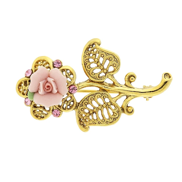 2028 Gold-Tone Pink Crystal and Porcelain Rose Brooch