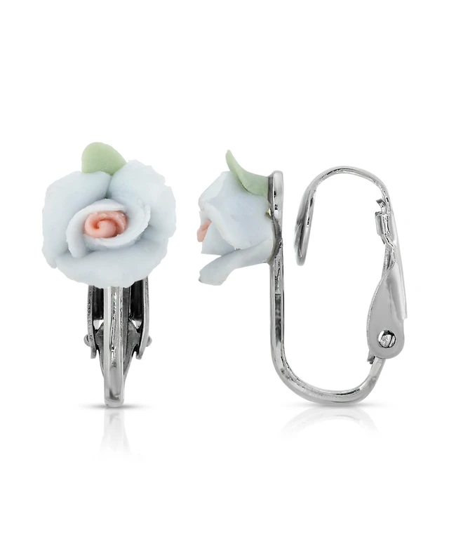 2028 Silver Tone Porcelain Rose Clip-on Earrings
