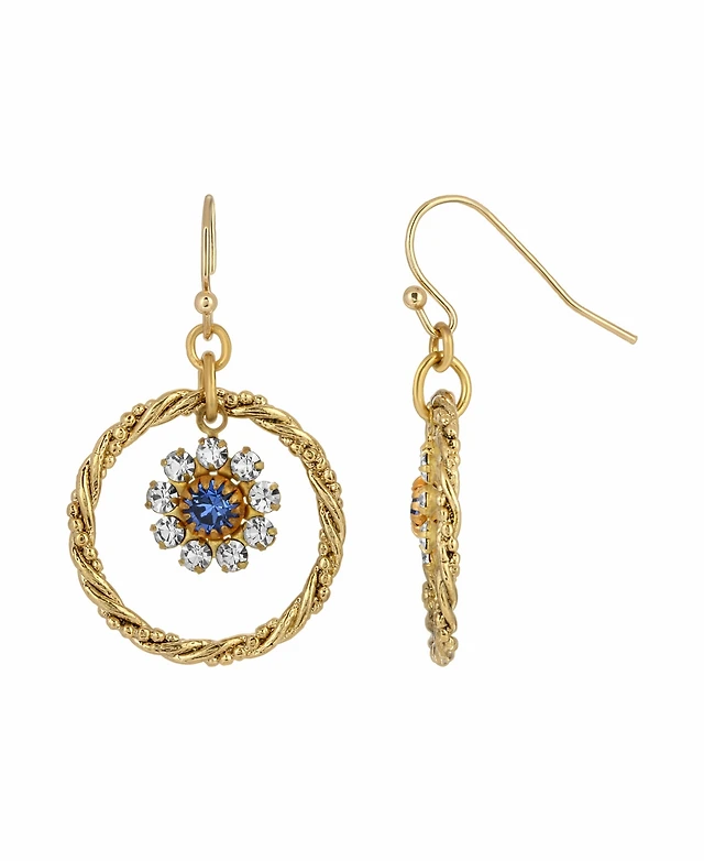 Women's Gold-tone Blue Crystal Flower Drop Hoop Earrings