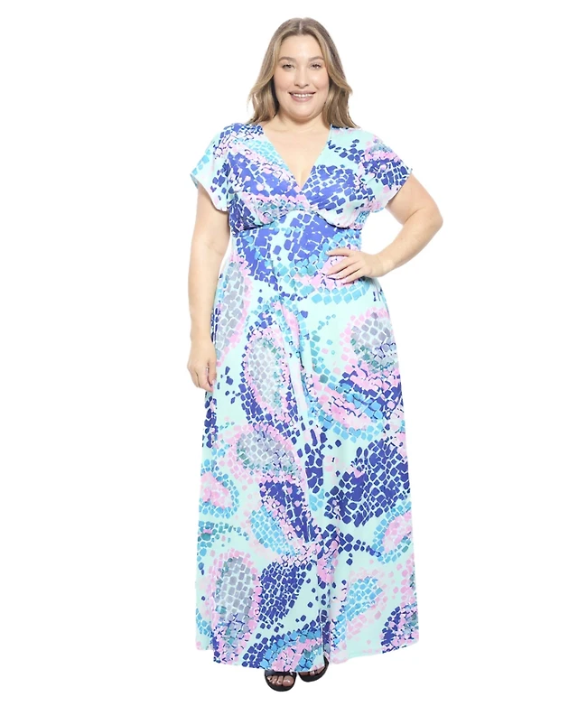 24seven Comfort Apparel Women's Abstract V-Neck Empire Waist Cap Sleeve Maxi Dress