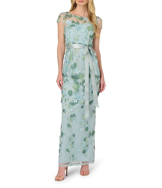 Adrianna Papell Floral Embroidered Illusion Boat Neck Short Sleeve Column Long Gown