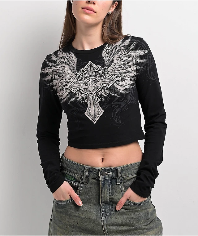 Affliction Ayala Skull Black Long Sleeve Crop T-Shirt