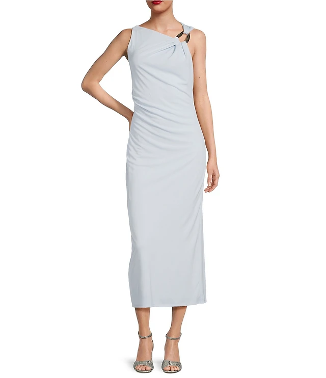 Alex Marie Camila Stretch Satin Asymmetrical One Shoulder Metal Loop Strap A-Line Maxi Dress