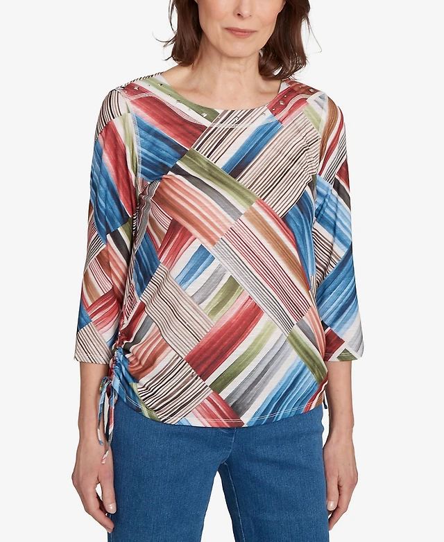 Alfred Dunner Women's Classic Stripe Patchwork Ruched Sides Top