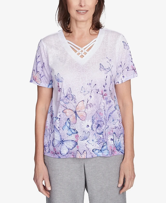 Alfred Dunner Women's Crystal Springs Crisscross Ombre Butterfly V-Neck T-Shirt