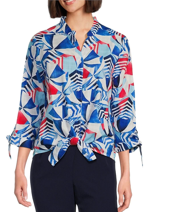 Allison Daley Beach Umbrella Print 3/4 Tie Sleeve Y-Neck Tie Hem Blouse