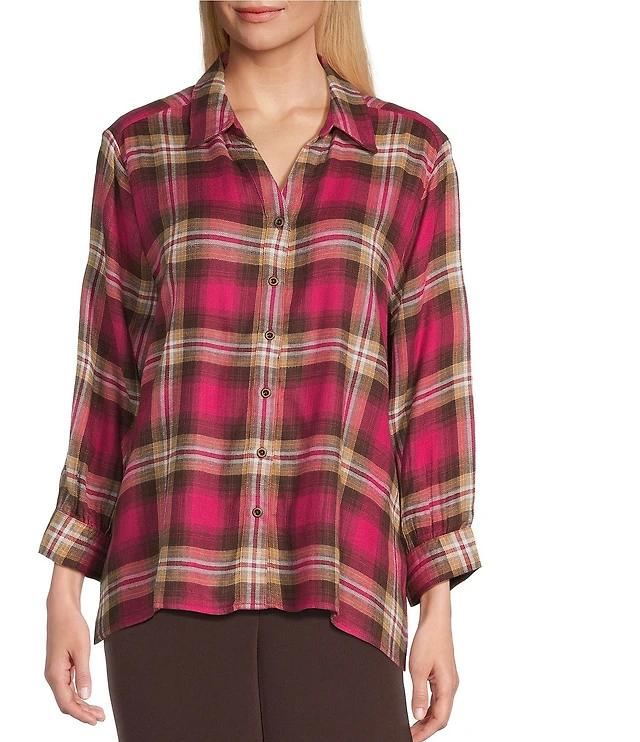 Allison Daley Petite Size Ombre Plaid 3/4 Sleeve Point Collar Button Front Shirt