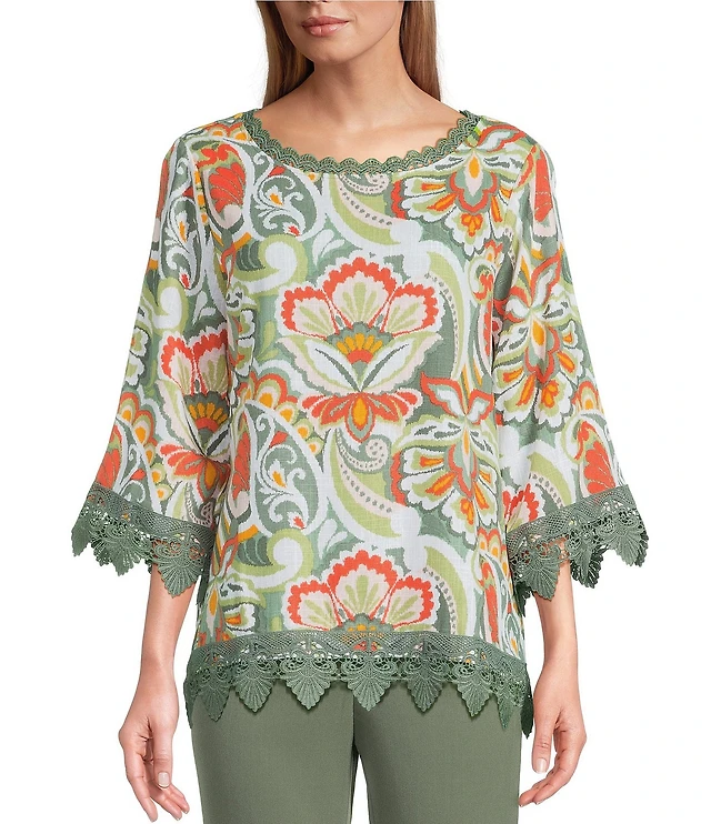Allison Daley Petite Size Vintage Paisley Print 3/4 Sleeve Crew Neck Lace Detail Linen Blend Blouse