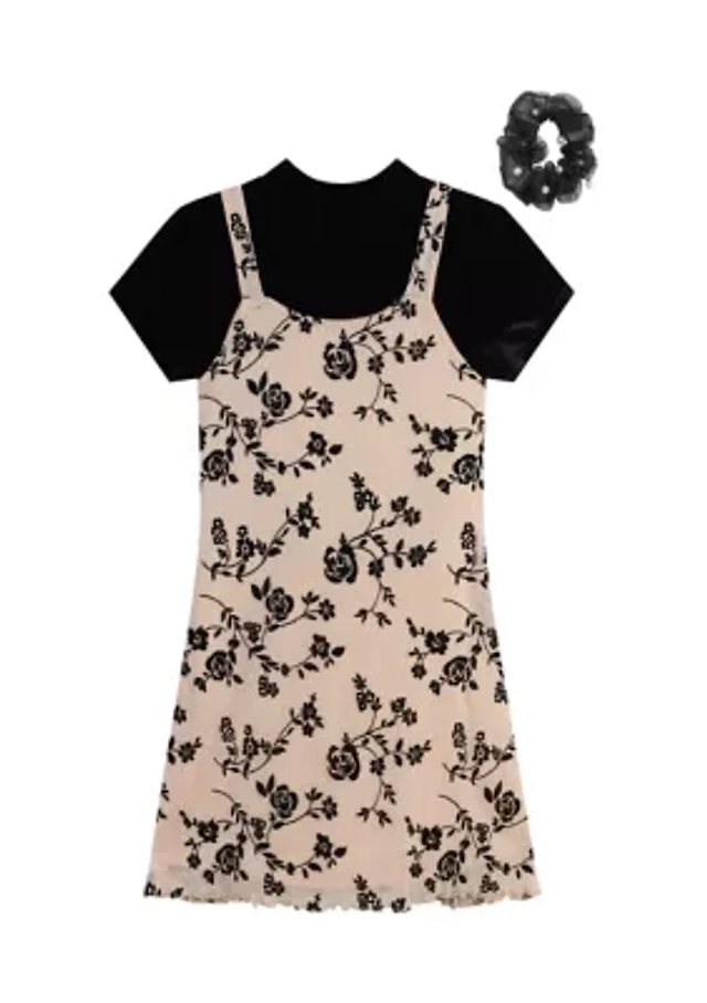 Girls 7-16 Printed Jumper Dress with Scrunchie