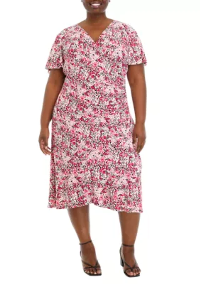 Plus Faux Wrap Dress with Flutter Sleeves and Ruffle Skirt