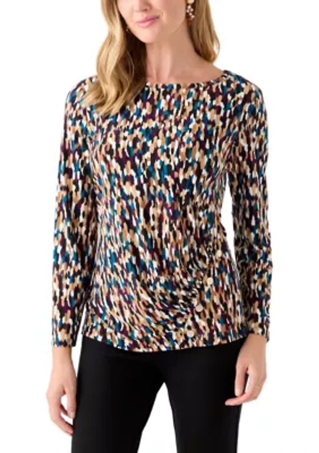 Petite Long Sleeve Popover Blouse with Covered Placket and Side Slits
