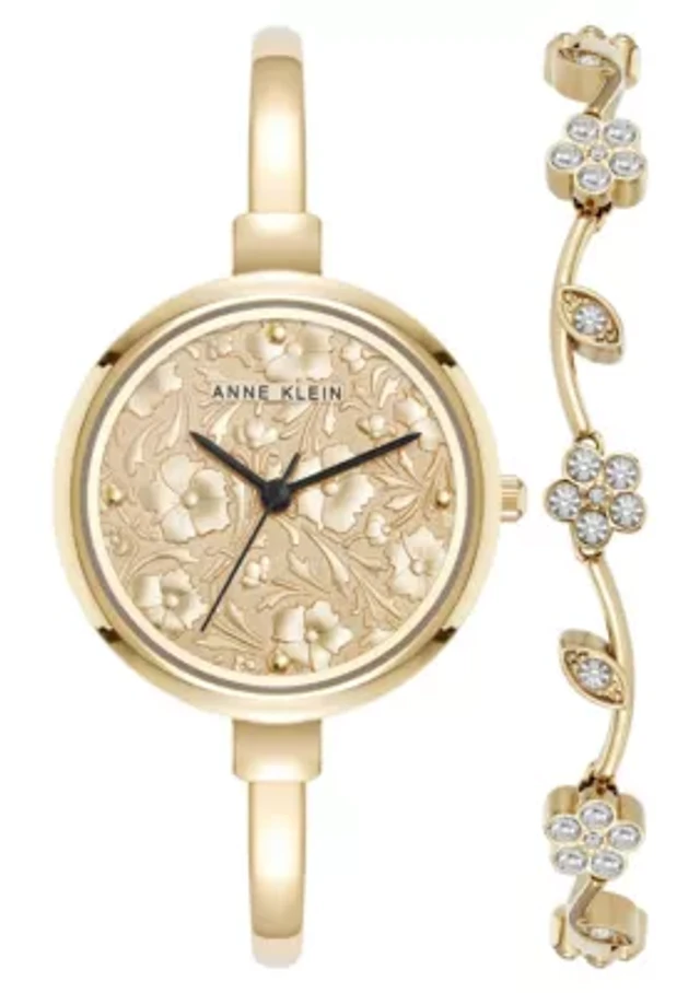 Anne Klein Women's Floral Dial Gold-Tone Metal Alloy Bangle Watch Set, 32mm