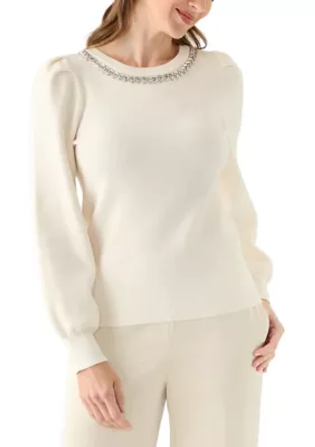 Petite Diamond Stitch Puff Sleeve Crew Neck Sweater