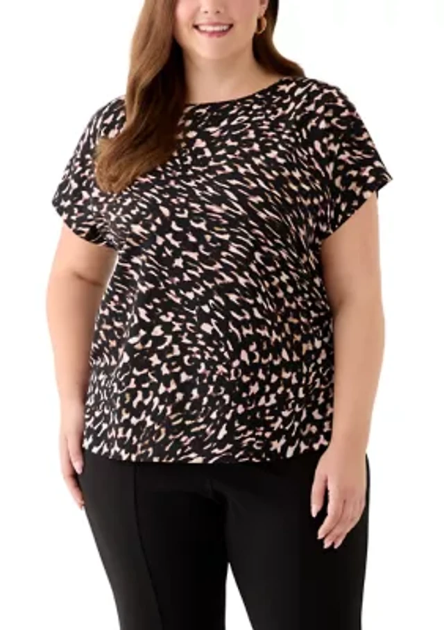 Plus Short Sleeve Printed Satin Bateau Neck Top