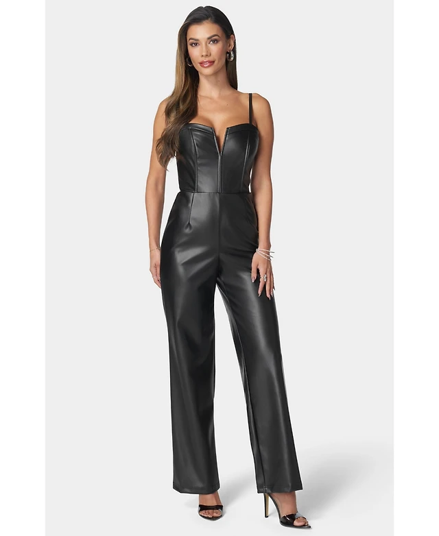 Bebe Women's V-Neck Jumpsuit with Powermesh Sleeve