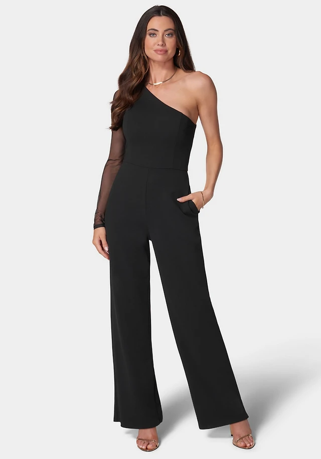 Bebe Women's Long Sleeve Mesh One Shoulder Jumpsuit