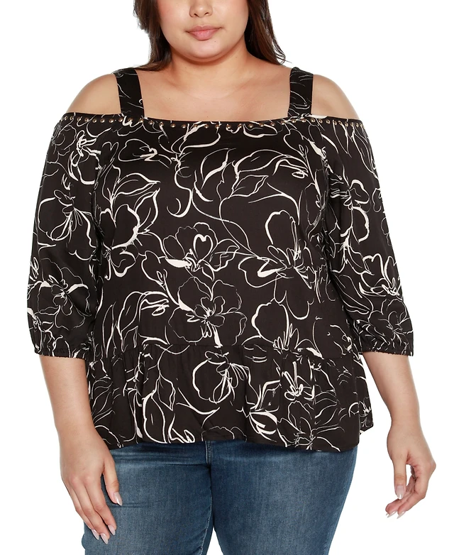 Belldini Plus Black Label Rhinestone Grommet Cold-Shoulder Sweater