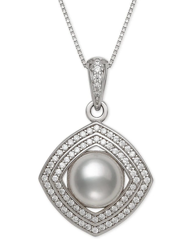 Cultured Freshwater Pearl (8mm) & Cubic Zirconia 18" Pendant Necklace in Sterling Silver