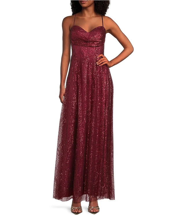 Blondie Nites Glitter Sweetheart Neck Illusion Corset Bodice Open Tie Back Dress