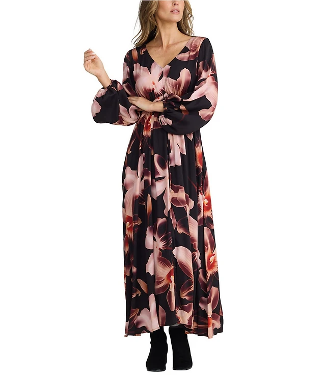 Brave + True Daylight Long Sleeve V-Neckline Tie Front Printed Maxi Dress
