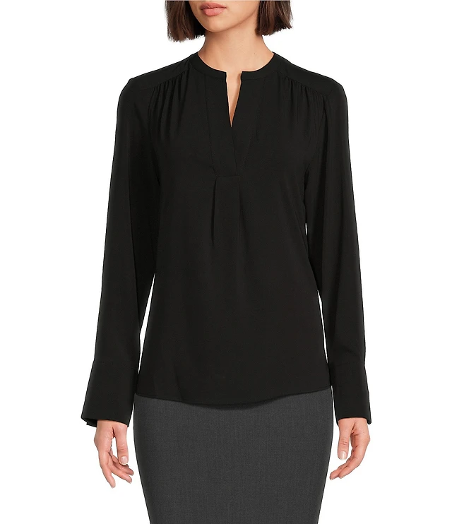 Calvin Klein Solid Crepe de Chine Split V-Neck Long Sleeve Blouse