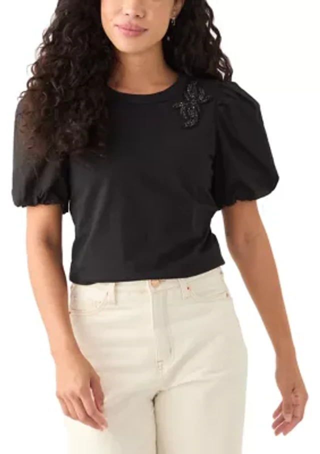 CeCe Crepe Knit Point Collar V-Neck Short Puffed Sleeve Shirt