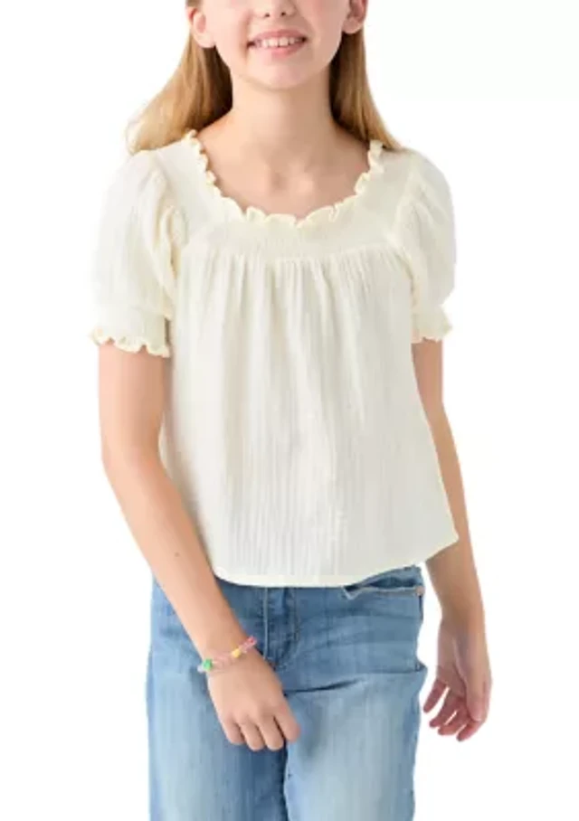 CeCe V-Neck Short Puff Sleeve Embroidered Tie Front Top