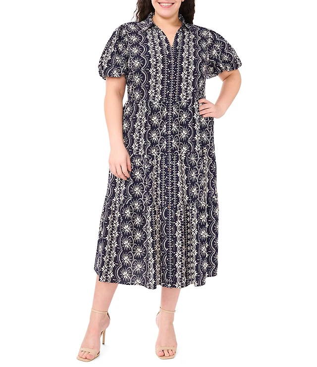 CeCe Plus Size Woven Printed Collared Short Puff Sleeve Button Front Tiered Midi Dress