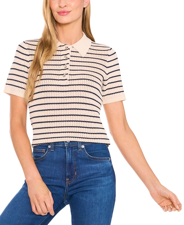 CeCe Women's Striped Short-Sleeve Polo Sweater