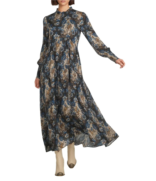 Double D Ranch De Witts Printed Woven Ruffle Collar Long Sleeve Empire Waist A-Line Maxi Dress