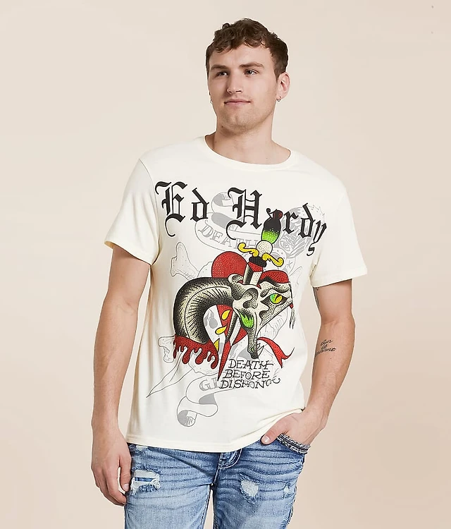Ed Hardy Love Kills Slowly Heart Rhinestone Ivory Cap Sleeve T-Shirt