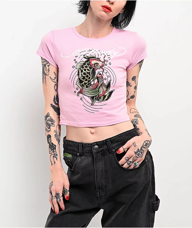 Ed Hardy Koi Fish Maroon Crop T-Shirt