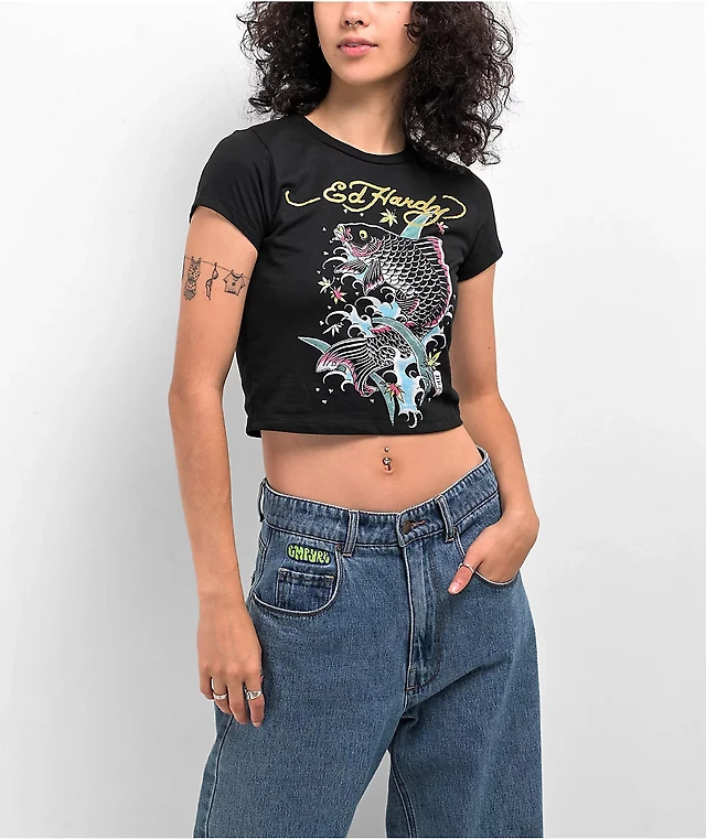 Ed Hardy Cross Heart Black Long Sleeve Crop T-Shirt