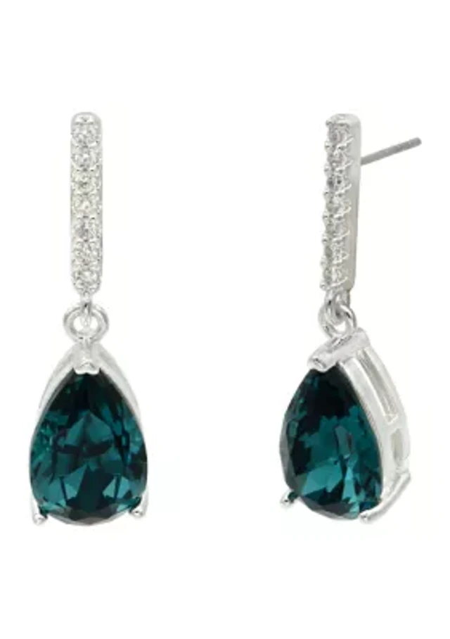 Lab Grown Silver Tone Denim Crystal Teardrop with Pave CZ Drop Earrings