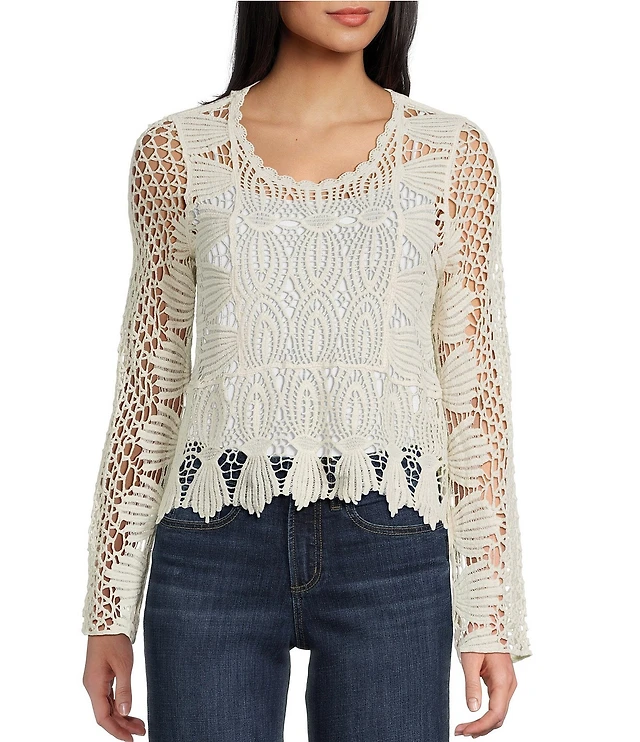 Evolutionary Knit Lace Scoop Neck Long Sleeve Top