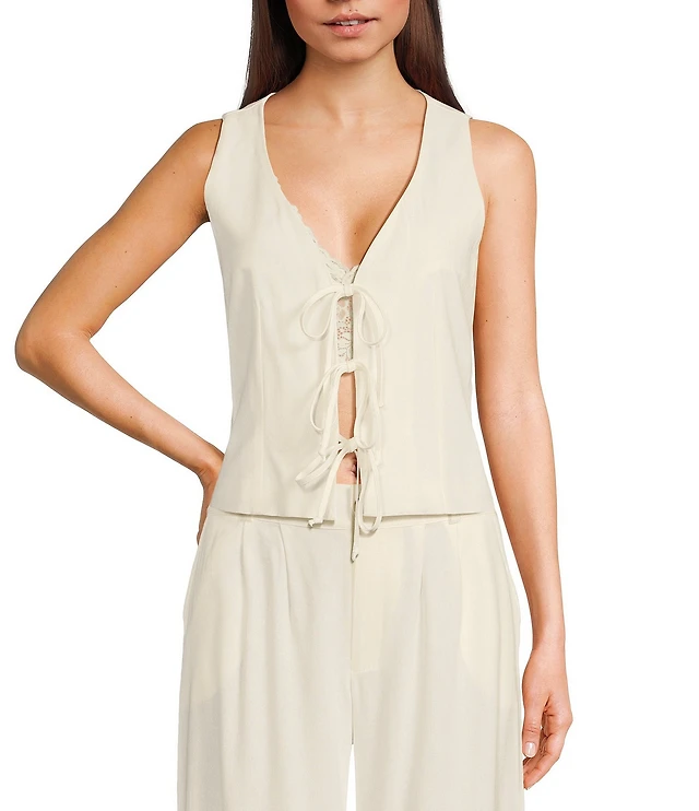 Evolutionary Sweater Knit Scoop Neck Cap Sleeve Tie Front Top