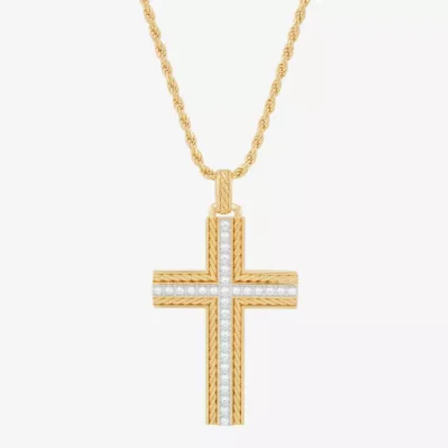 Crucifix Mens White Cubic Zirconia 14K Gold Over Silver Cross 24 Inch Pendant Necklace