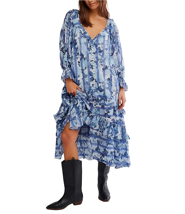 Free People Calla Floral Print Sweetheart Neckline Long Sleeve Midi Dress