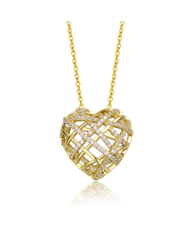 Sterling Silver 14k Yellow Gold Plated with Cubic Zirconia Knotted Ribbon 3D Puffed Heart Pendant Necklace