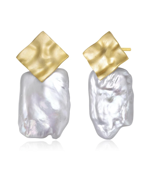 Sterling Silver 14K Gold Plated with Genuine Freshwater Pearl Dangle Earrings