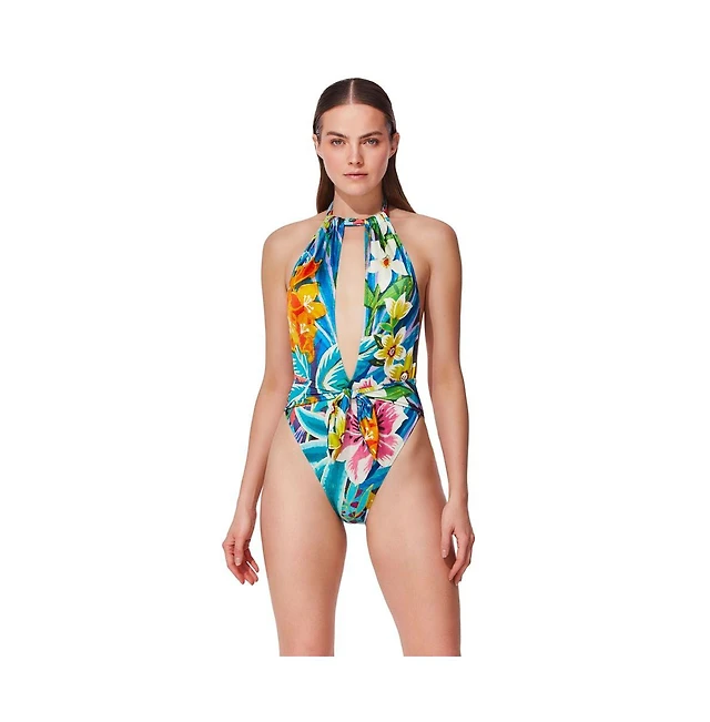 Gottex Tropicana Floral Print Halter Neck Cut-Out Plunge Cheeky One Piece Swimsuit