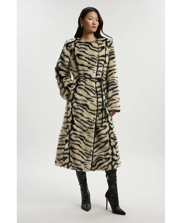 Karen Millen Women's Faux Fur Collarless Tie Belted Midi Coat