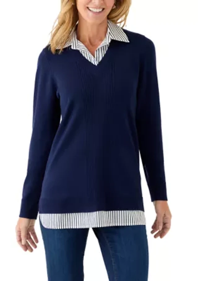 Women's Long Sleeve Cable Crew Neck Stripe Sweater