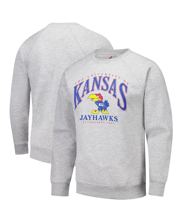 League Collegiate Wear Men's Heather Gray Kansas Jayhawks Tall Arch Essential 2.0 Pullover Sweatshirt