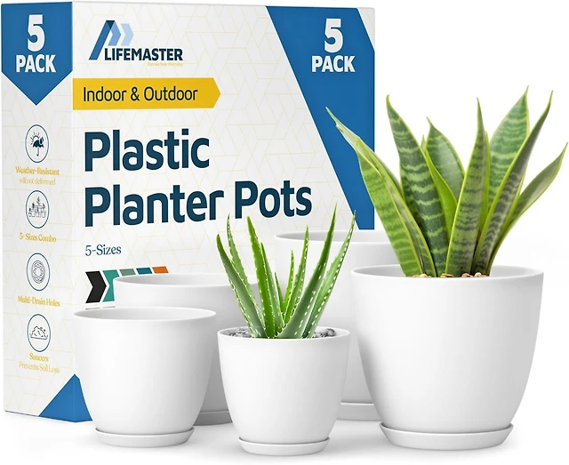 Lifemaster White Plant Pots with Drainage Holes & Saucers 5 Packs, Indoor & Outdoor Stackable Plastic Planters in Multiple Sizes for Houseplants & Flo