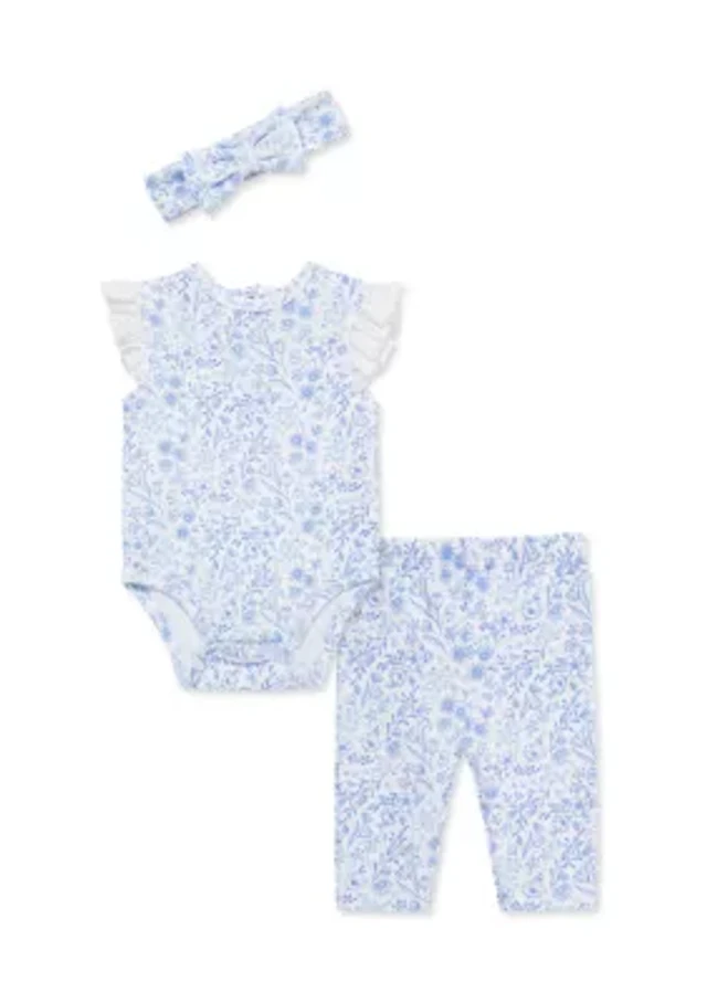 Baby Girls Floral Eyelet Bodysuit and Pants Set with Headband