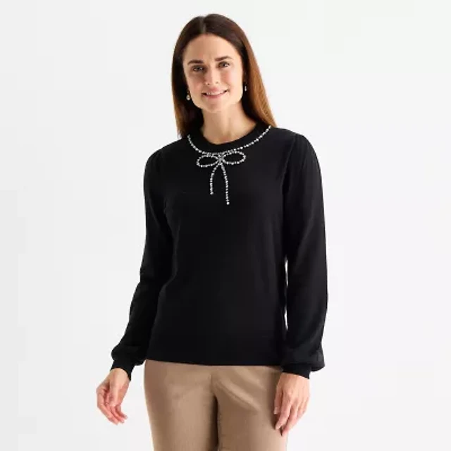 Liz Claiborne Tall Womens Crew Neck Embellished Long Sleeve Pullover Sweater