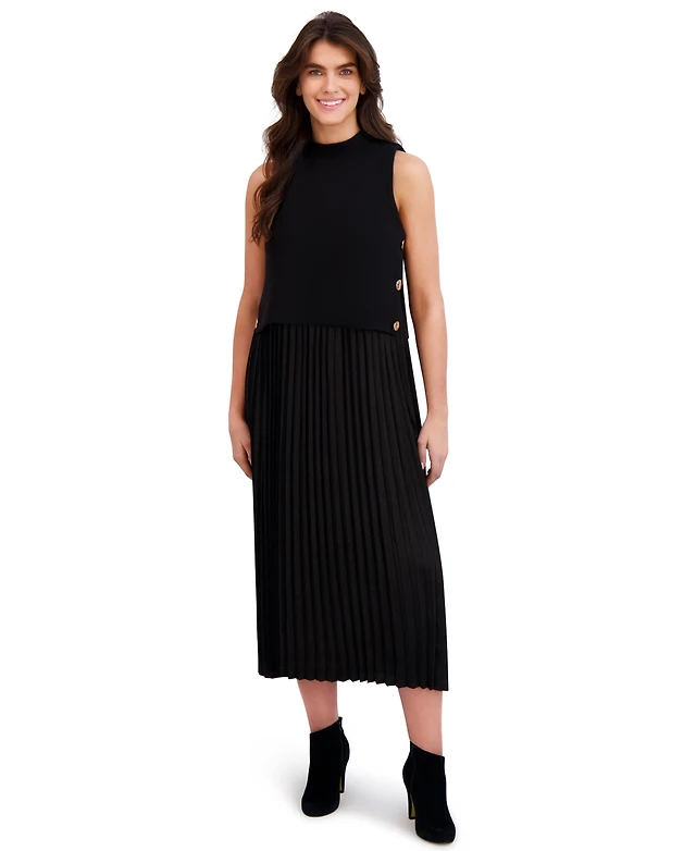 London Times Women's Pleat-Neck Sleeveless Dress