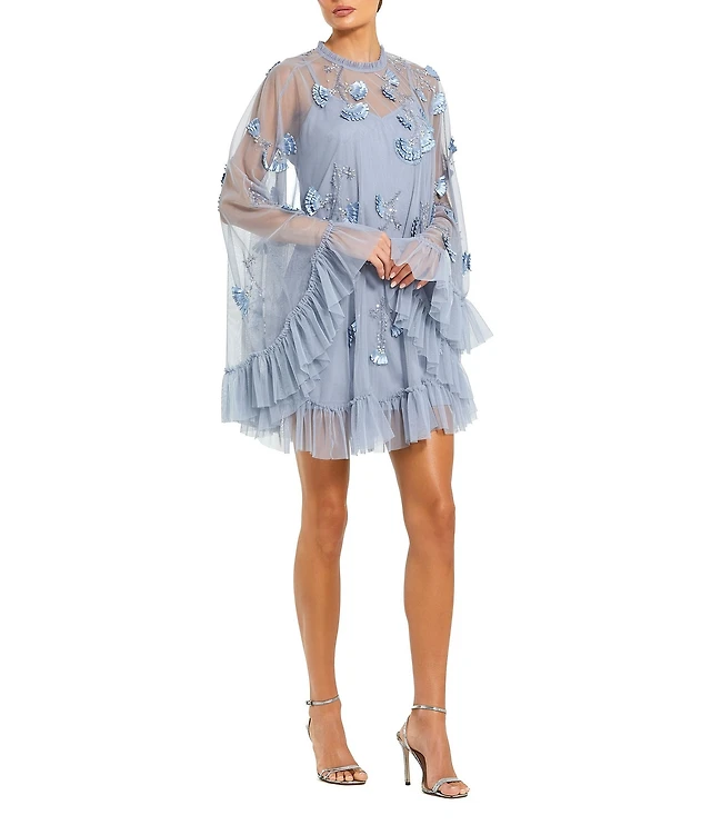 Mac Duggal Crew Neck Ruffle Hem Long Cape Sleeve Waistless Mini Dress