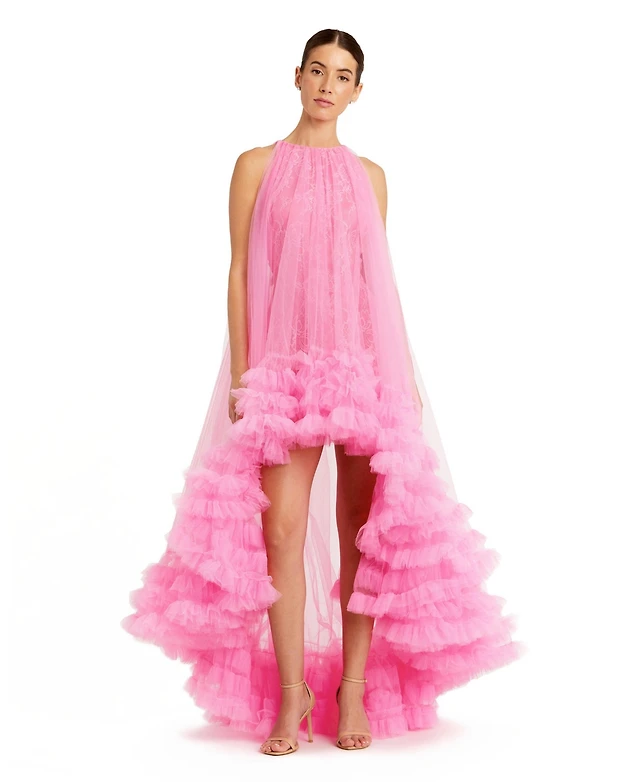 Mac Duggal Women's Tulle High Neck Sleeveless Ruffled Hem Hi-Lo Gown